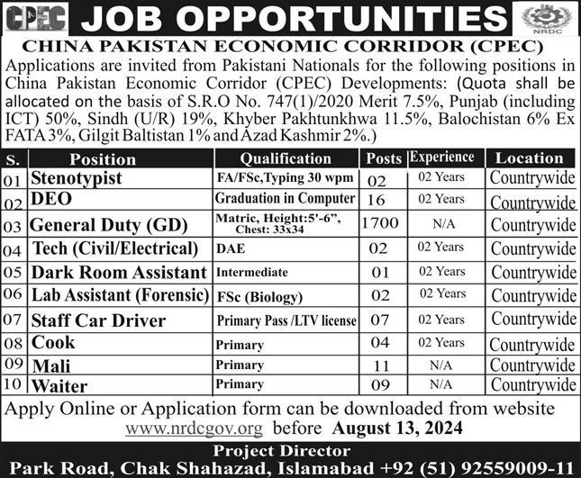 Applications are invited from Pakistani Nationals for the following positions in China Pakistan Economic Corridor (CPEC) Developments: (Quota shall be allocated on the basis of S.R.O No. 747(1)/2020 Merit 7.5%, Punjab (including ICT) 50%, Sindh (U/R) 19%, Khyber Pakhtunkhwa 11.5%, Balochistan 6% Ex FATA 3%, Gilgit Baltistan 1% and Azad Kashmir 2%.)