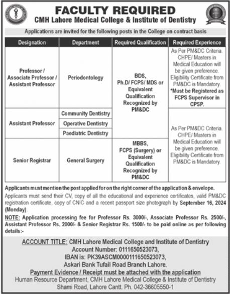 Assistant Professor job at CMH Lahore Medical College and institute of Dentistry