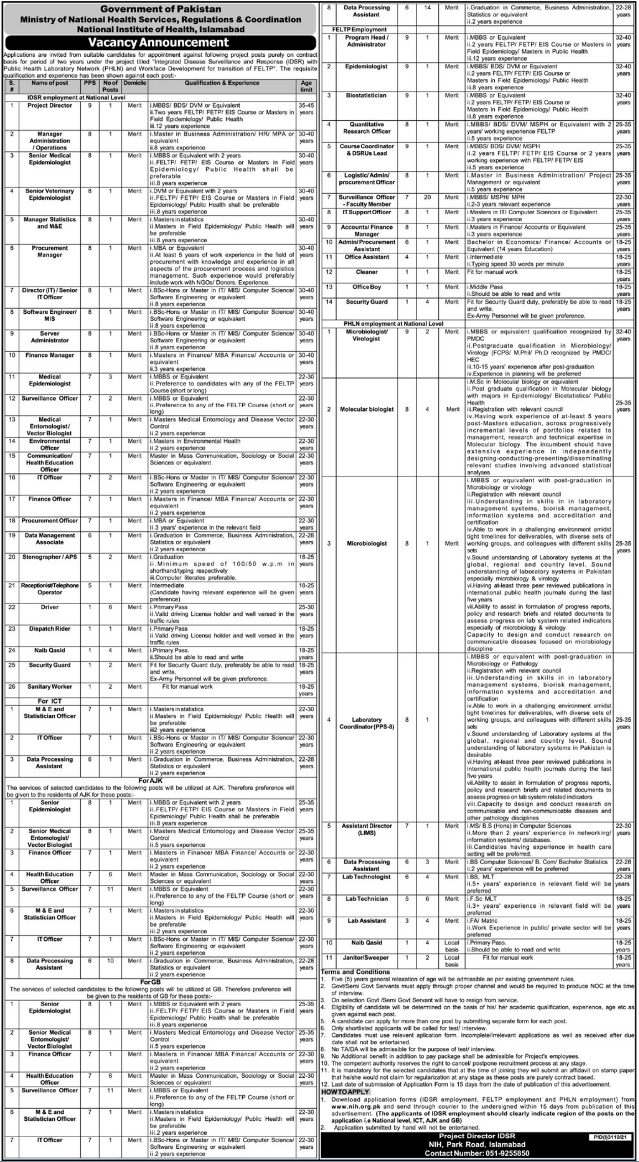 1. Download application forms (IDSR employment, FELTP employment and PHLN employment) from www.nih.org.pk and send through courier to the undersigned within 15 days from publication of this advertisement. (The applicants of IDSR employment should clearly indicate region of the posts on the application i.e. National level, ICT, AJK and GB) 2. Applications submitted by hand will not be entertained.