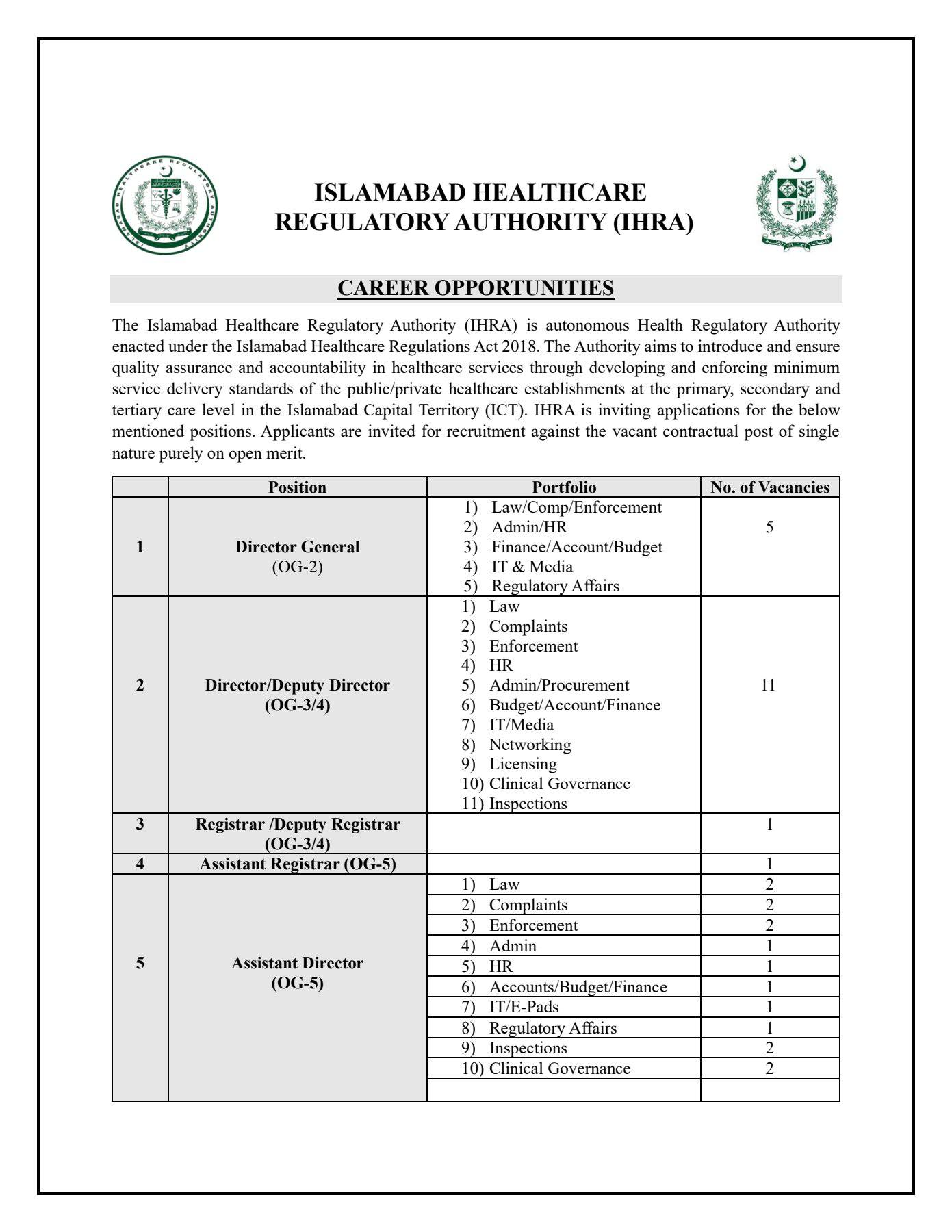 Further detail for job description, terms, conditions and required credentials/experience can be downloaded from National Job Portal (http://njp.gov.pk/). This advertisement is also available onIy lslamabad Healthcare Regulatory Authority website (http//ihra.gov.pk/).