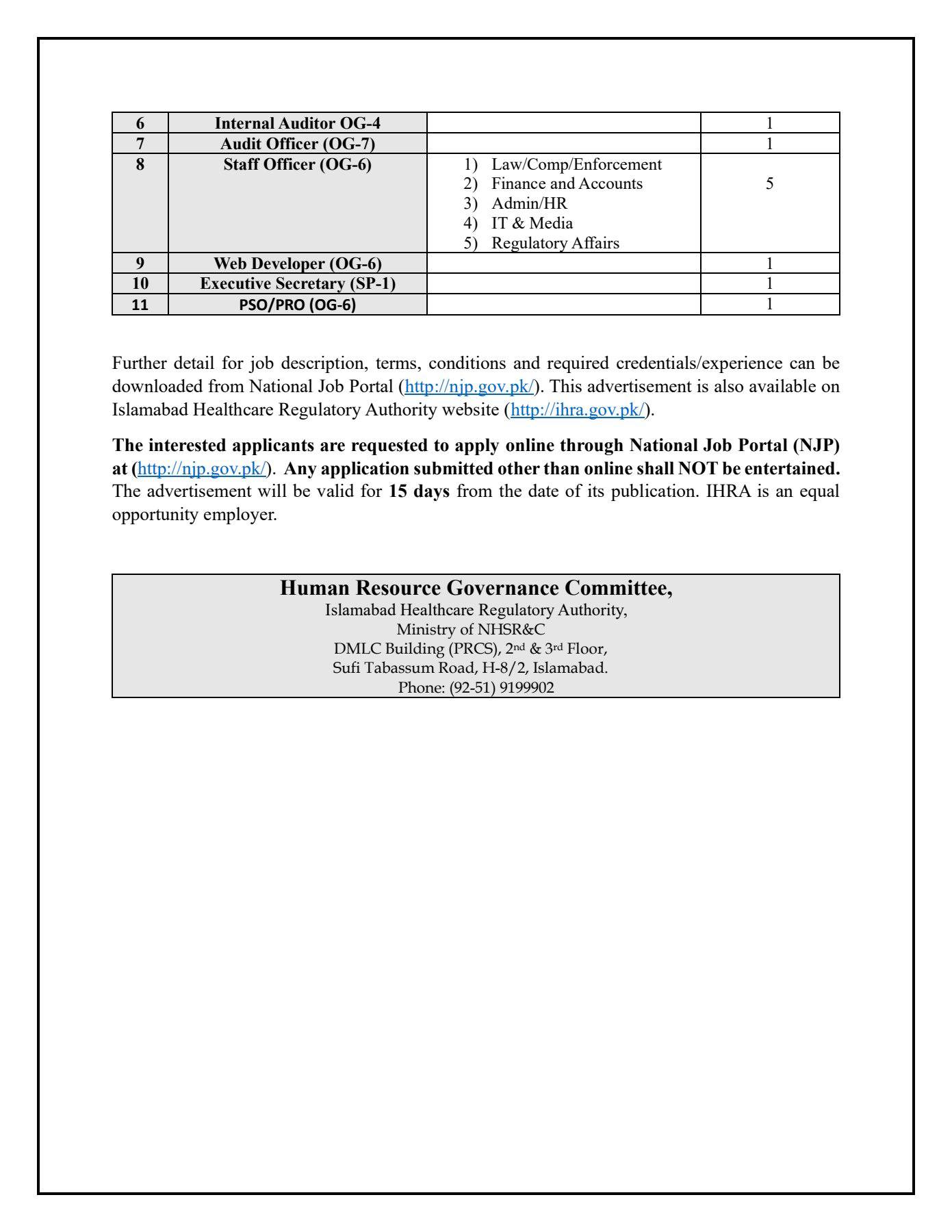 Further detail for job description, terms, conditions and required credentials/experience can be downloaded from National Job Portal (http://njp.gov.pk/). This advertisement is also available onIy lslamabad Healthcare Regulatory Authority website (http//ihra.gov.pk/).