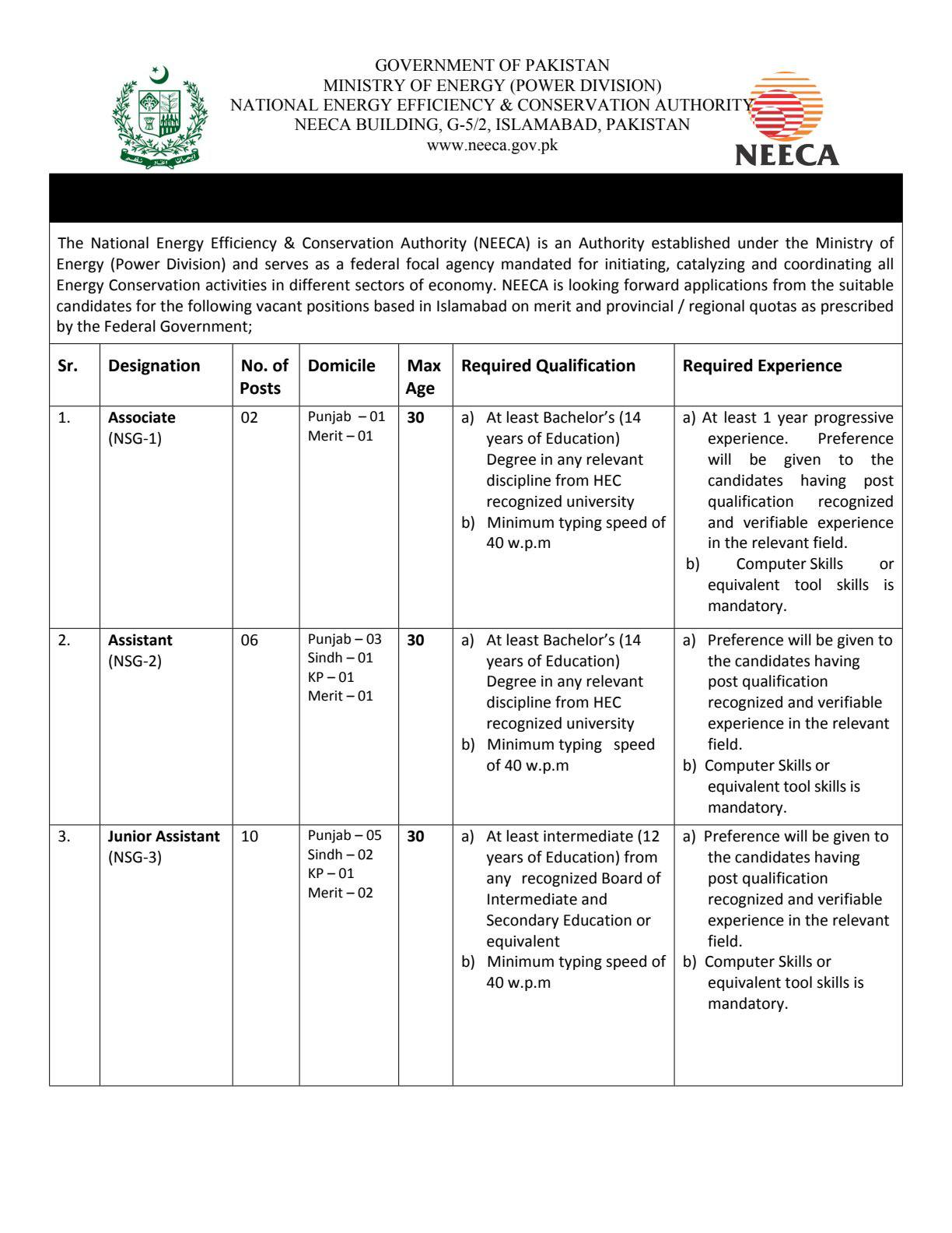 The National Energy Efficiency & Conservation Authority (NEECA) is an Authority established under the Ministry of Energy (Power Division) and serves as a federal focal agency mandated for initiating, catalyzing and coordinating all Energy Conservation activities in different sectors of economy. NEECA is looking forward applications from the suitable candidates for the following vacant positions based in Islamabad on merit and provincial / regional quotas as prescribed by the Federal Government;