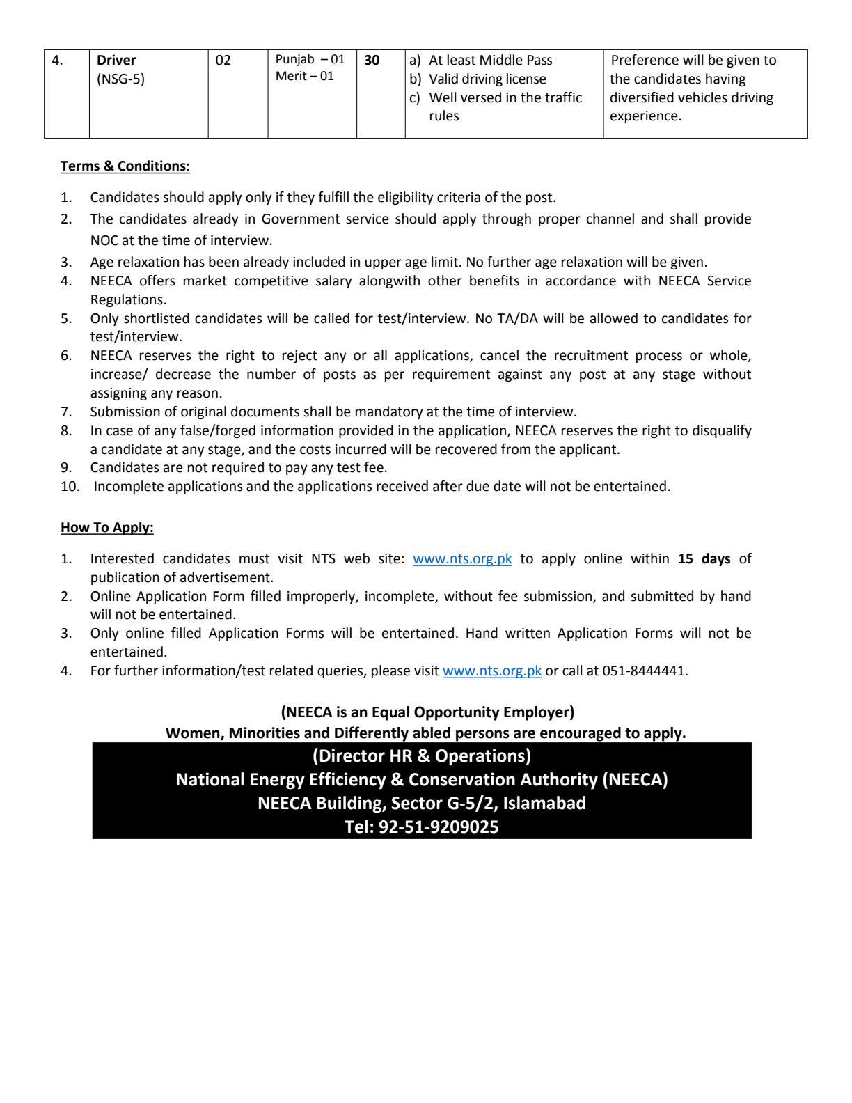 1. Interested candidates must visit NTS web site: www.nts.org.pk to apply online within 15 days of publication of advertisement. 2. Online Application Form filled improperly, incomplete, without fee submission, and submitted by hand will not be entertained. 3. Only online filled Application Forms will be entertained. Hand written Application Forms will not be entertained. 4. For further information/test related queries, please visit www.nts.org.pk or call at 051-8444441.
