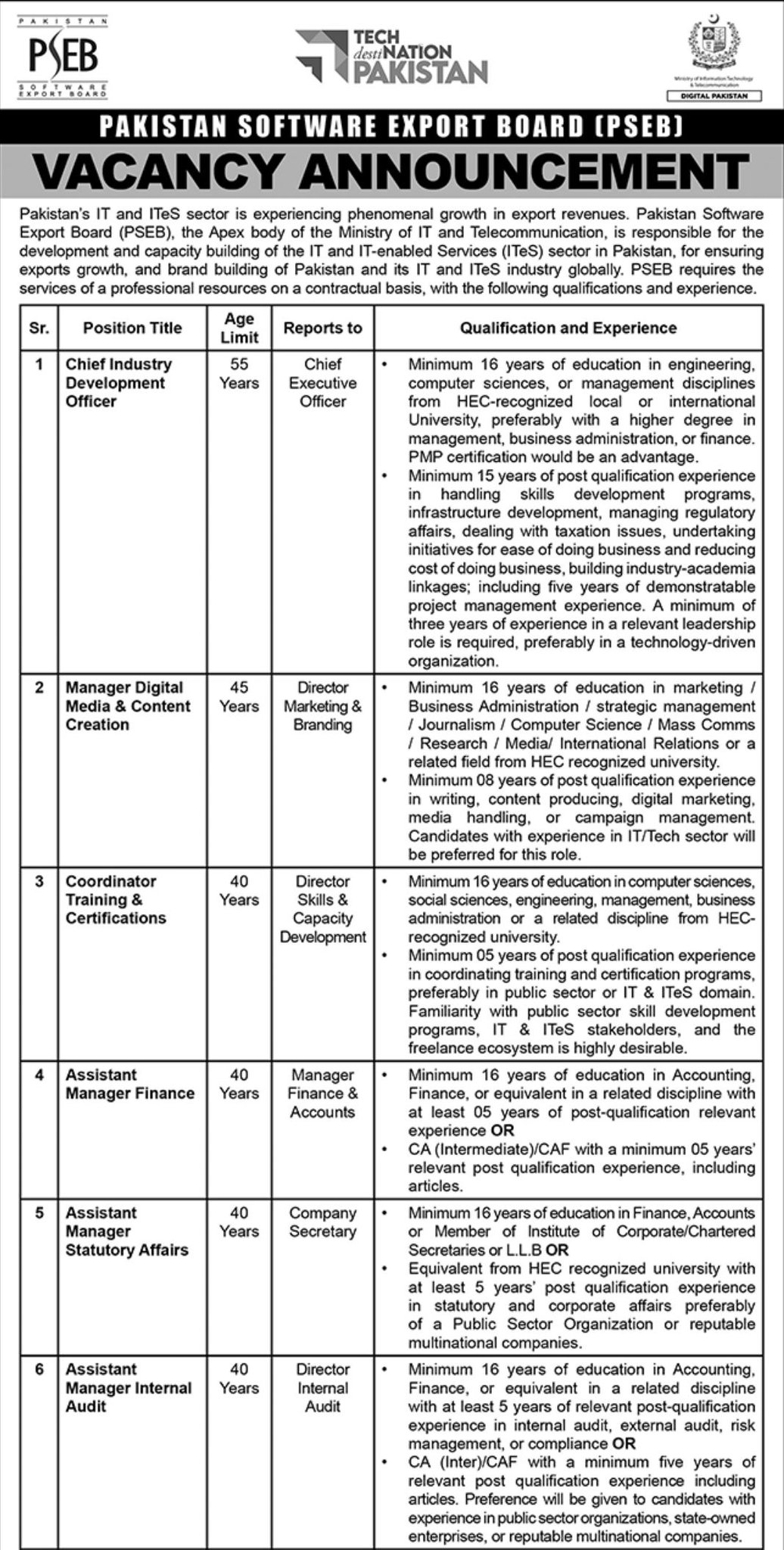 Pakistan's IT and ITeS sector is experiencing phenomenal growth in export revenues. Pakistan Software Export Board (PSEB), the Apex body of the Ministry of IT and Telecommunication, is responsible for the development and capacity building of the IT and IT-enabled Services (ITeS) sector in Pakistan, for ensuring exports growth, and brand building of Pakistan and its IT and ITeS industry globally. PSEB requires the services of a professional resources on a contractual basis, with the following qualifications and experience.