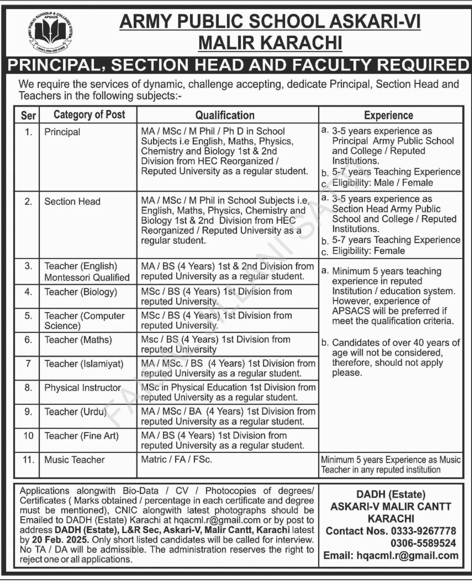 Applications along with Bio-Data / CV / Photocopies of degrees/Certificates (Marks obtained / percentage in each certificate and degree must be mentioned), CNIC along with latest photographs should be Emailed to DADH (Estate) Karachi at hqacml.r@gmail.com or by post to address DADH (Estate), L&R Sec, Askari-V, Malir Cantt, Karachi latest by 20 Feb 2025. Only shortlisted candidates will be called for interview. No TA / DA will be admissible. The administration reserves the right to reject one or all applications.