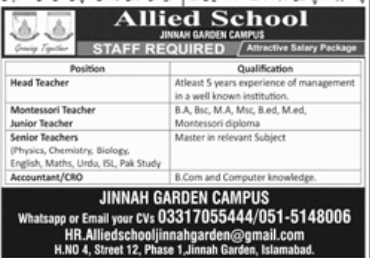 Send your CVs through WhatsApp 03317055444 or email HR.alliedschooljinnahgarden@gmail.com