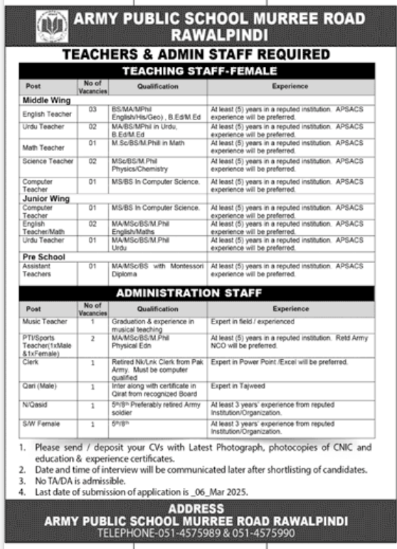 Computer Teacher job at Junior Wing Army Public School Murree Road Rawalpindi