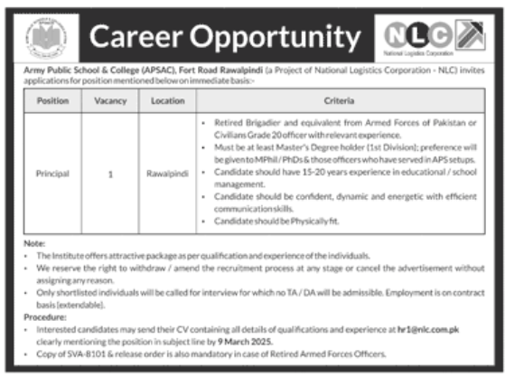 Army Public School & College (APSAC), Fort Road Rawalpindi (a Project of National Logistics Corporation NLC) invites applications for the position mentioned below on an immediate basis