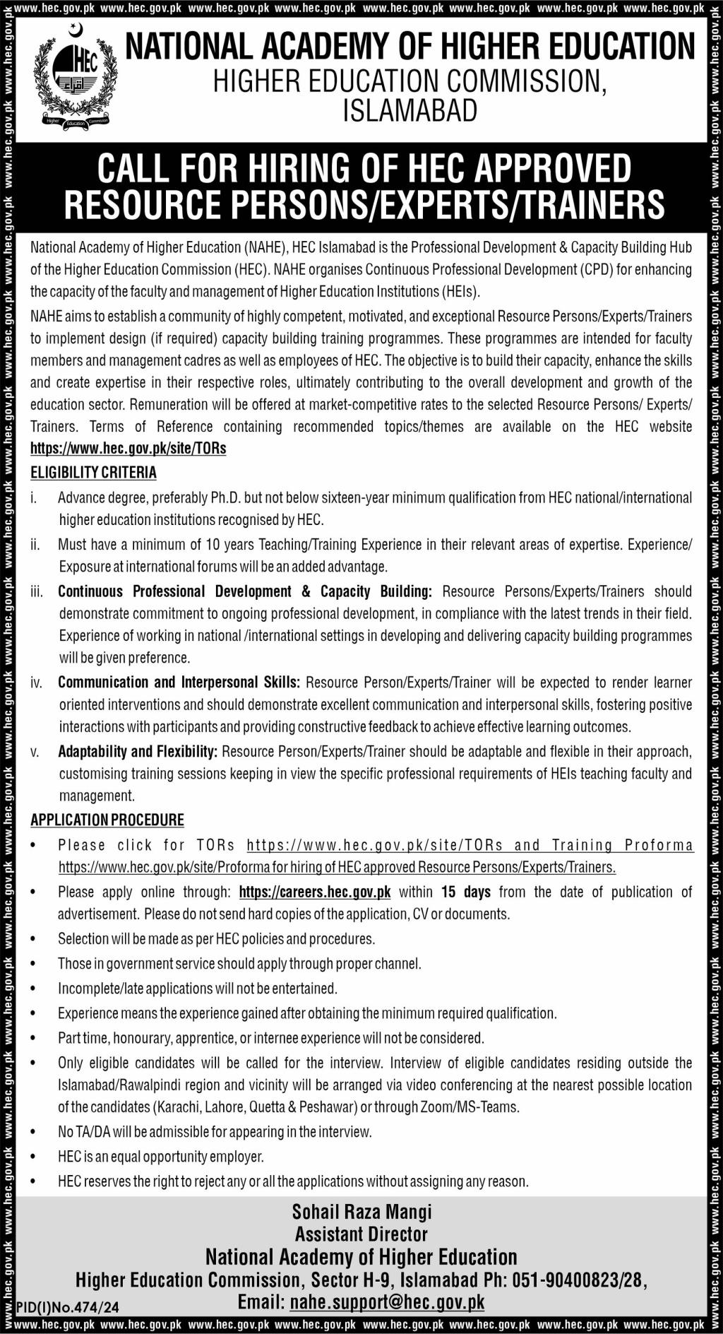Please click for TORs https://www.hec.gov.pk/site/TORs and Training Proforma https://www.hec.gov.pk/site/Proforma for hiring of HEC approved Resource Persons/Experts/Trainers, Please apply online through: https://careers.hec.gov.pk within 15 days from the date of publication of advertisement.