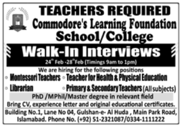 Bring a CV, experience letter, and original educational certificates. Building No.1, Lane No 04, Gulshan-e-Al Huda, Main Park Road, Islamabad. Phone No. (+92) 51-2321087/0334-1111222