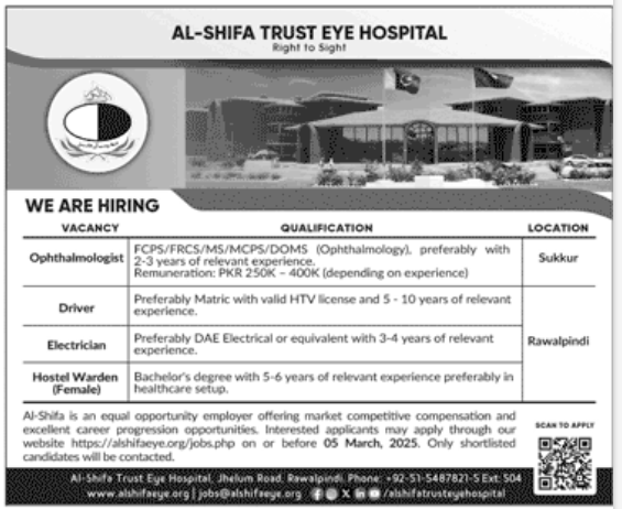 Al-Shifa is an equal opportunity employer offering market-competitive compensation and excellent career progression opportunities. Interested applicants may apply through our website https://alshifaeye.org/jobs.php on or before 05 March 2025. Only shortlisted candidates will be contacted.