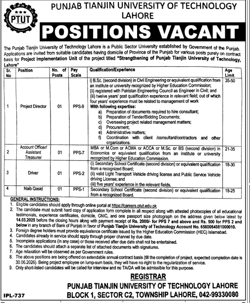 Eligible candidates should apply through the online portal at https://careers.ptut.edu.pk The candidate must submit the hard copy of the application form complete in all respects along with attested photocopies of all educational testimonials, experience certificates, domicile, CNIC, and one passport-size photograph at the address given below latest by 14.03.2025 before the closing hours along with payment receipt of Rs. 2000/- for PPS 7 and above and Rs. 500 for PPS 2 and below in any branch of Bank of Punjab in favor of Punjab Tianjin University of Technology Account No. 6580064981000010.