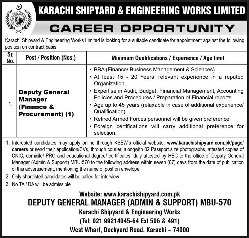 - Interested candidates may apply online through KSEW's official website, www.karachishipyard.com.pk/page/careers, or send their application/CVs, through courier, along with 02 Passport-size size photographs, attested copies of CNIC, domicile/ PRC and educational degree/ certificates, duly attested by HEC to the office of Deputy General Manager (Admin & Support) MBU-570 to the following address within seven (07) days from the date of publication of this advertisement, mentioning the name of the post on the envelope.